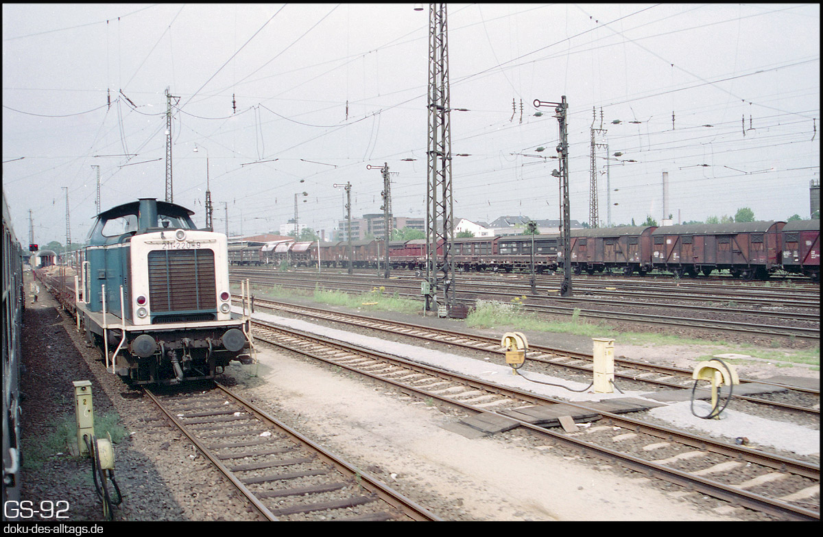 27.) Links rangiert eine V60, aus Richtung Fulda kommt eine 120. Im Bw steht eine 211 oder 212 und zwei 140er. Die Strecke nach Friedberg umrundet das Bw südostwärts auf der rechten Seite, vollzieht eine 180°-Kurve, überquert dann die Kinzigtalbahn, führt dann erstmal Richtung Nordwesten (genau parallel entgegengesetzt zum Bahnhof) und schwenkt dann fast nach Norden auf Hanau Nord zu.
