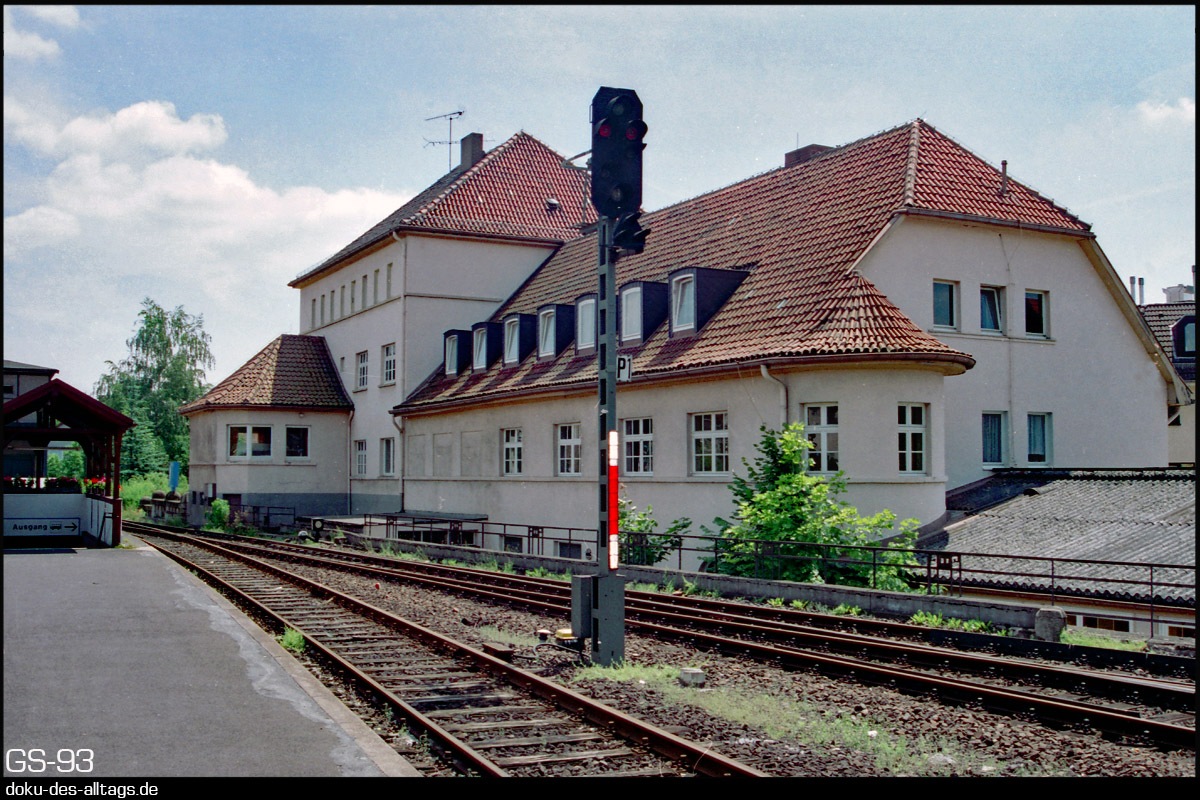 2.) Die Bahnhofsgleise befinden sich in Hochlage, das massive Bahnhofsgebäude befindet sich im Bereich der südlichen Bahnhofsausfahrt. Der Bahnhof hat seit 1970 Lichtsignale, die vom elektromechanischen Stellwerk Kf [VES 1912 (E43)] gestellt werden. Der Stellwerksbau befindet sich an der nördlichen Ausfahrt. Der Stellwerksanbau hier am Empfangsgebäude hatte zu diesem Zeitpunkt keine Funktion mehr.