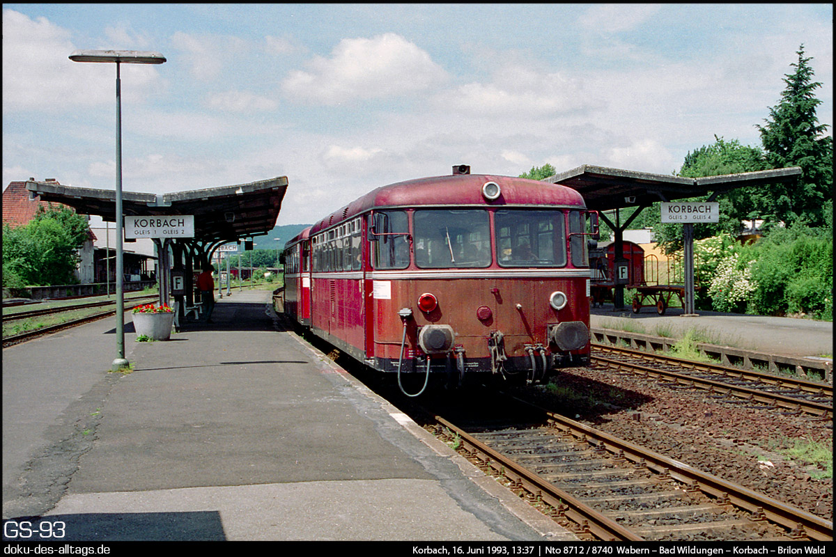 1.) Um 13:37 kommt der Nto 8740 nach 1,5-stündiger Fahrt ab Wabern im Bahnhof Korbach an. Der Bahnhof ist hauptbahnmäßig ausgestattet: vier Bahnsteiggleise an langen, überdachten Inselbahnsteigen, erreichbar durch eine Unterführung am südlichen Ende. Dort sind hier auch noch Gepäckaufzüge vorhanden (wenn auch nicht mehr in Betrieb). Wenige Jahre zuvor fuhren hier noch Eilzüge, bestehend aus mehreren Wagen und mit 216 oder 218 bespannt.