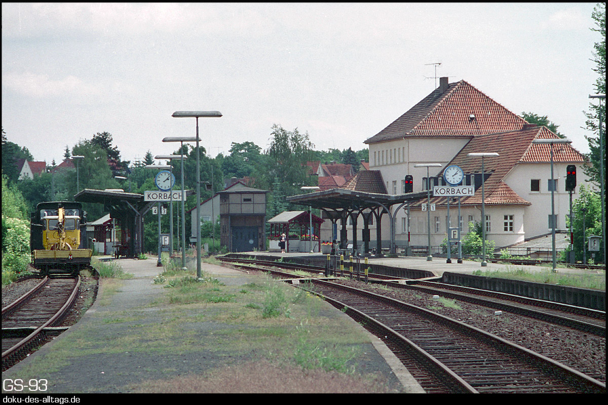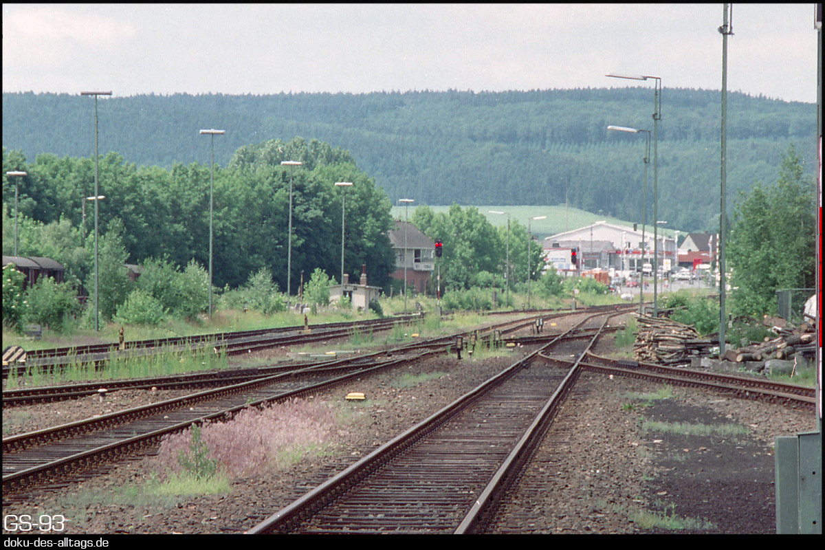 4.) Die nördliche Ausfahrt vom Bahnhof Korbach. Hier ist das oben erwähnte Stellwerk Kf zu sehen. Ein Stück weiter nördlich trennen sich die Strecken nach Brilon Wald und Volkmarsen (– Kassel). Zum Zeitpunkt der Aufnahme war jedoch nur die Strecke nach Brilon Wald in Betrieb. Volkmarsen war nur per Schienenbus von Kassel Hbf aus erreichbar. Seit 1998 besteht wieder durchgehender Personenverkehr.