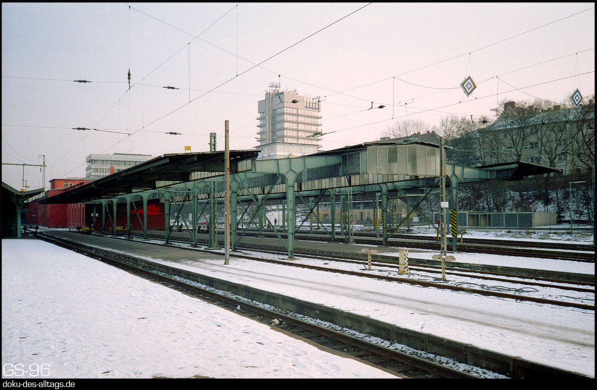 5.) Gesamtansicht der Bahnsteiggleise. Momentan ist es ziemlich leer. Nur ganz weit hinten auf Gleis 4 ist, wenn man genau hinschaut, die grüne Front einer 141 zu sehen. Dabei handelt es sich um 141 100, die auf dem nächsten Bild zu sehen ist.