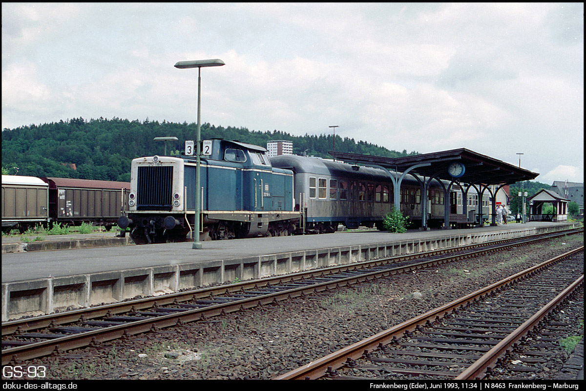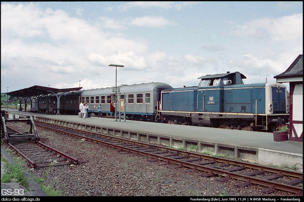 4.) Nun steht sie wieder vor ihrem Zug. Schon um 11:46 wirds als N 8463 zurück nach Marburg, das um 12:33 erreicht sein wird. 212 118 wurde Ende des Jahres 1993 ausgemustert.