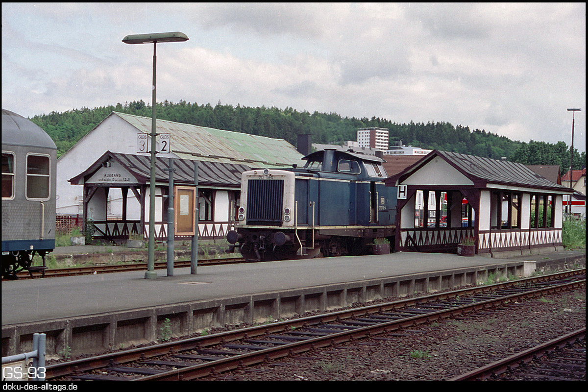 2.) Schon ist 212 118 abgekuppelt um ihre beiden Silberlinge zu umfahren. Die für Frankenberg charakteristische Kulisse bilden die Fachwerküberdachungen der Treppenabgänge und das Kreiskrankenhaus auf dem bewaldeten Hügel im Hintergrund jenseits des Flusses Eder.
