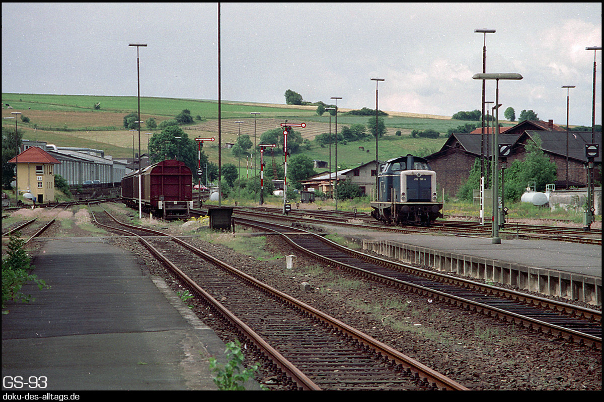 3.) Die südwestliche Ausfahrt des Bahnhofs. Links ist das Stellwerk Ff. Ausfahrsignale stehen an den Gleisen 2 und 3 sowie ein Gruppenausfahrsignal für die weiteren Gleise. Gleis 1 wird zu dieser Zeit nicht mehr für Zugfahrten genutzt. 212 118 ist hier gerade beim Umsetzen für ihren Nahverkehrszug nach Marburg.