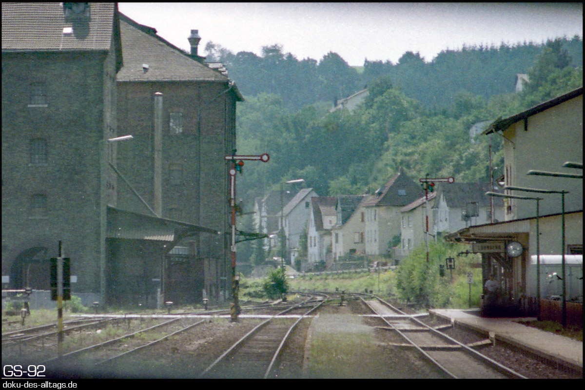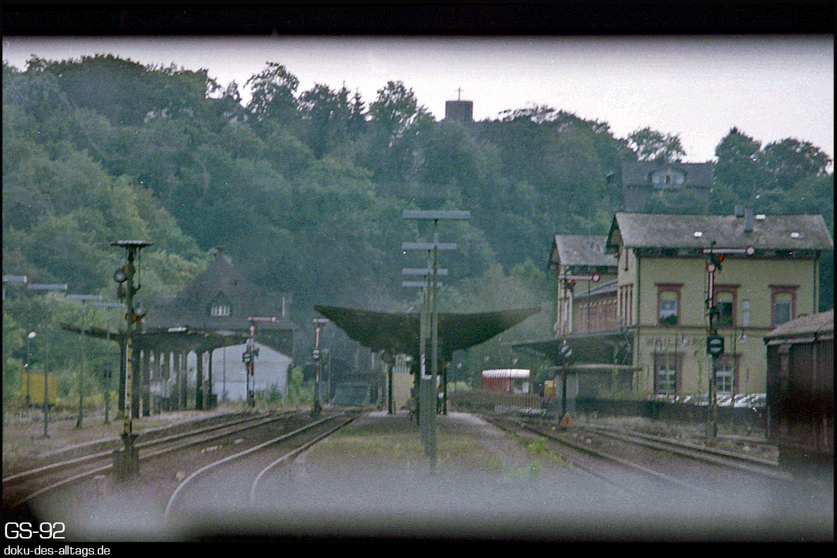 Zwar war der Lokschuppen links schon abgerissen, aber von der Kombination Tunnelportal-Bahnübergang-Gitterbrücke-Einfahrtsignal (im Hintergrund sichtbar) hätte ich doch gerne eine Aufnahme gemacht. Aber ich fuhr weiter. So blieb es nur bei dieser Ansicht mit EG und Stellwerk Wf. Zumindest ist rechts auch noch die Doppelkreuzungsweiche direkt am Bahnsteigende zu sehen.