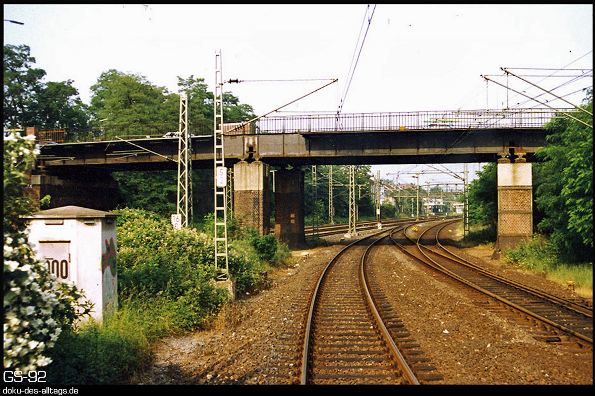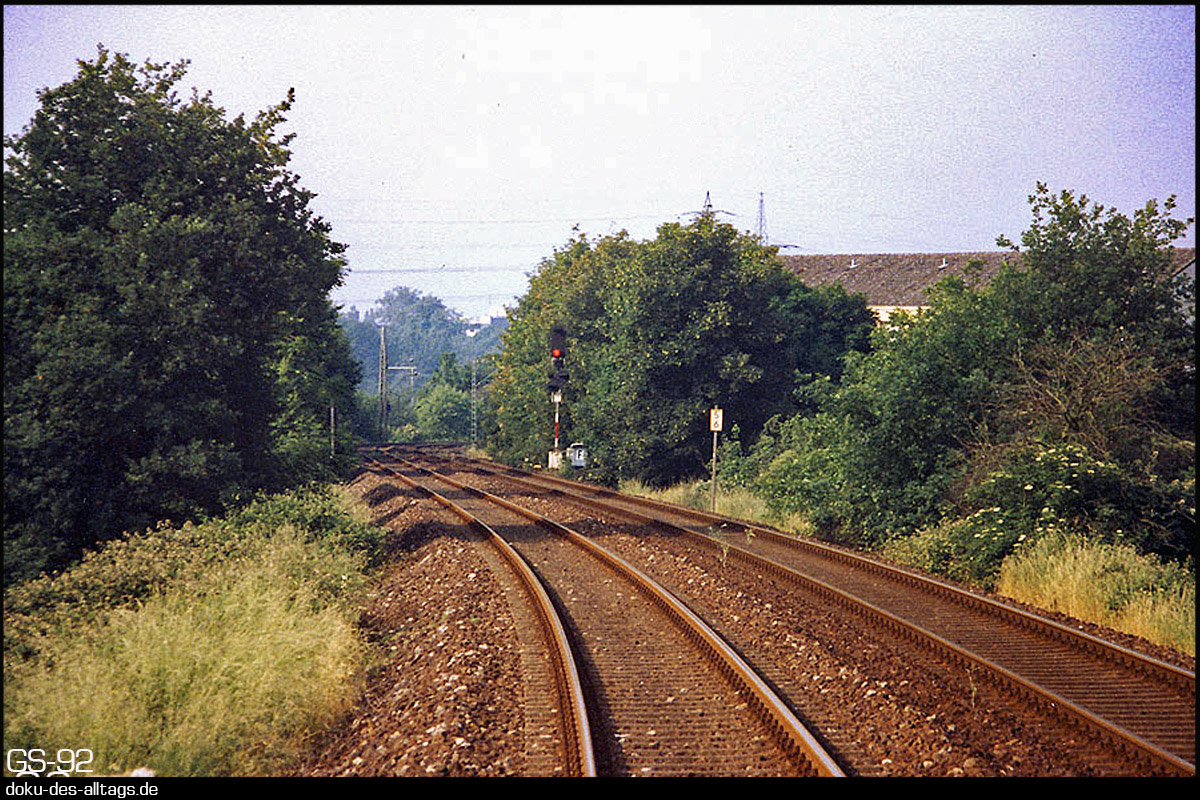 Züge nach Mettmann fuhren 1992 ohne Halt durch den Bahnhof Gerresheim, hier auch erkennbar, weil das mittlere Gleis ohne Bahnsteig befahren wird.
