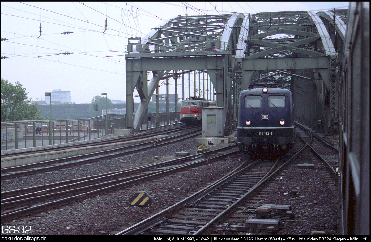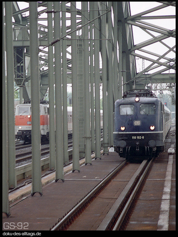 26. + 27.) Eine Fahrt über die Hohenzollernbrücke, hier zusammen mit 110 152 und 111 183 im Jahre 1992. Inzwischen kann der Rhein 6-gleisig überquert werden.