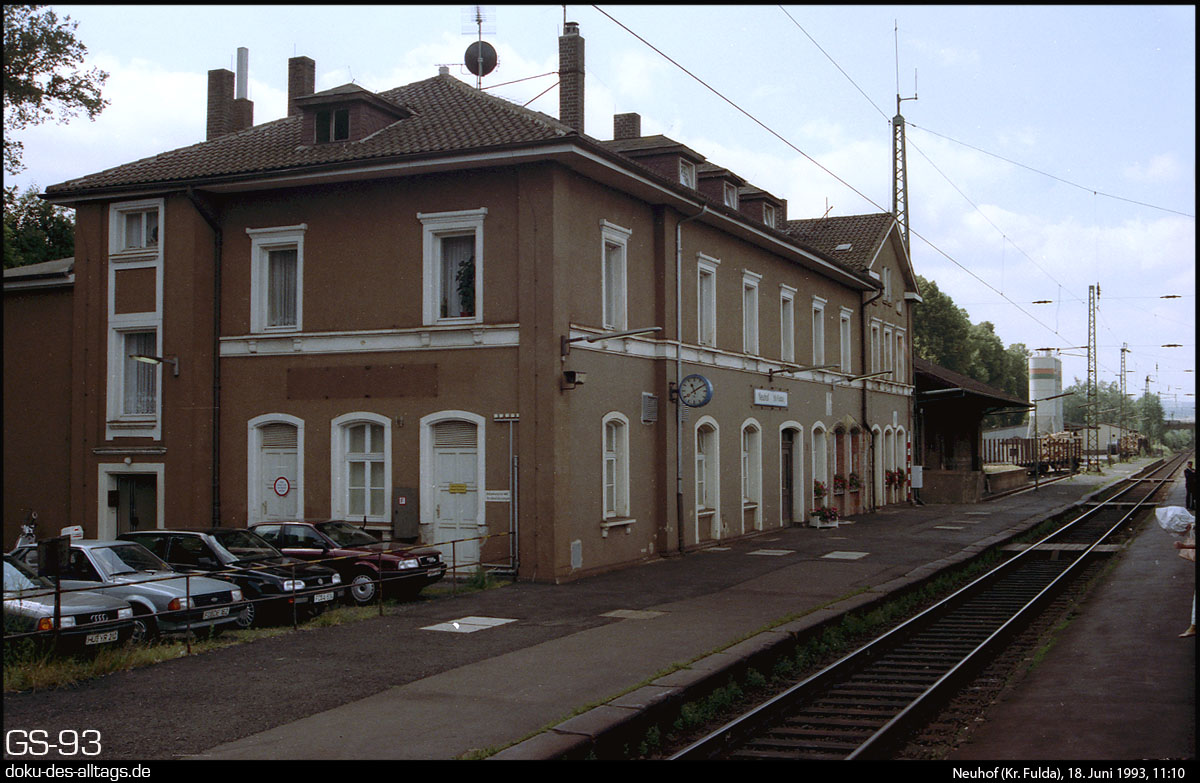 1.) Der Bahnhof Neuhof zwischen Flieden und Fulda. Durch eine Verbesserung der Linieführung der Strecke in den späten 1990er Jahren verlaufen heute die Streckengleise hinter dem Bahnhofsgebäude. Dort ist am Streckengleis Richtung Fulda auch ein Bahnsteig. In der Gegenrichtung halten Personenzüge hier am Hausbahnsteig am Bahnhofsgebäude.