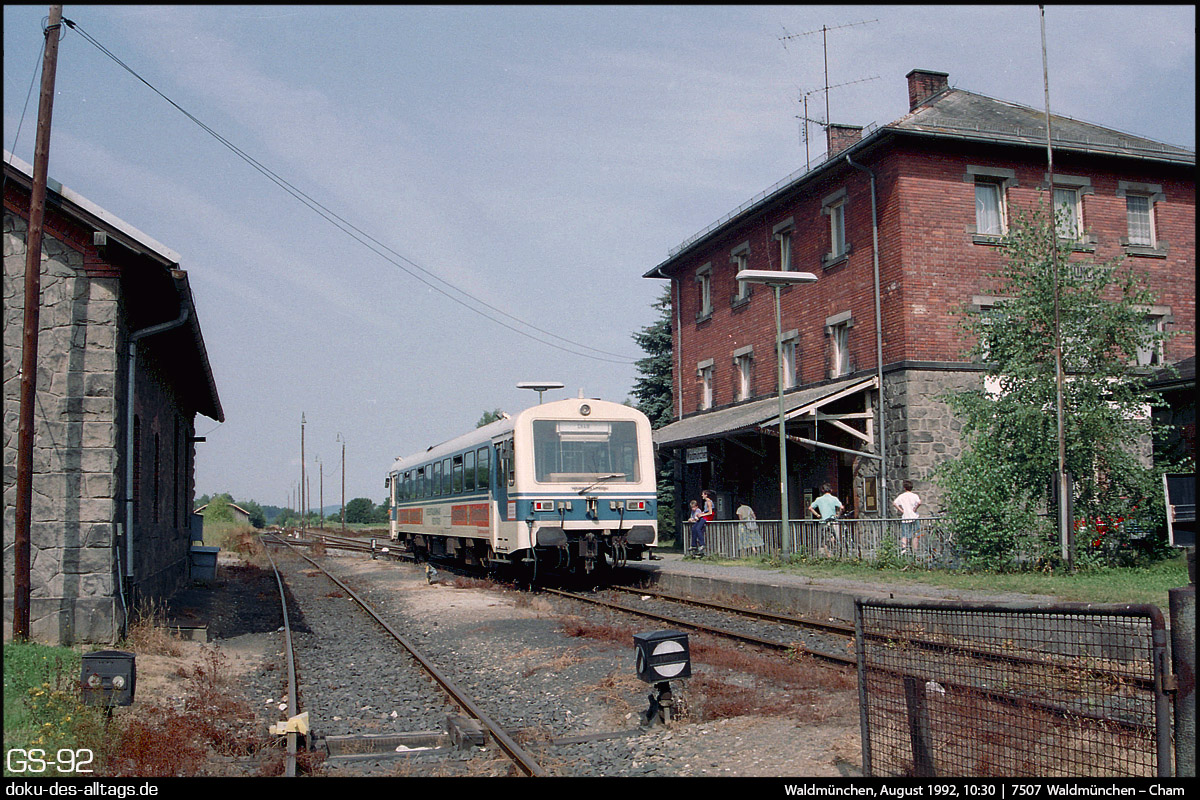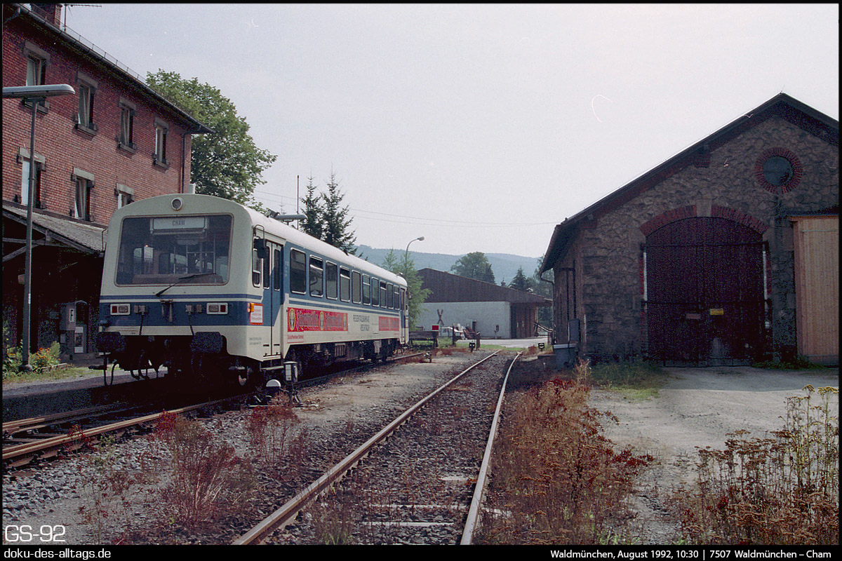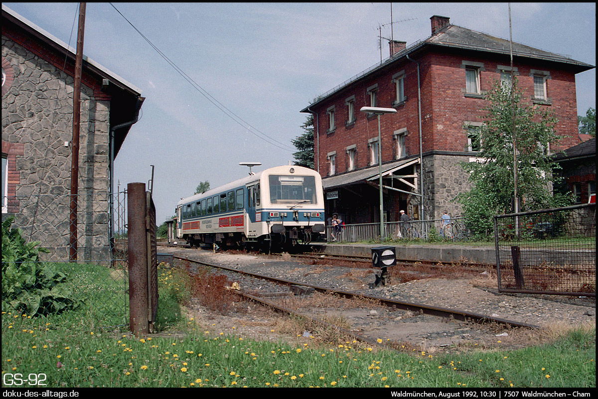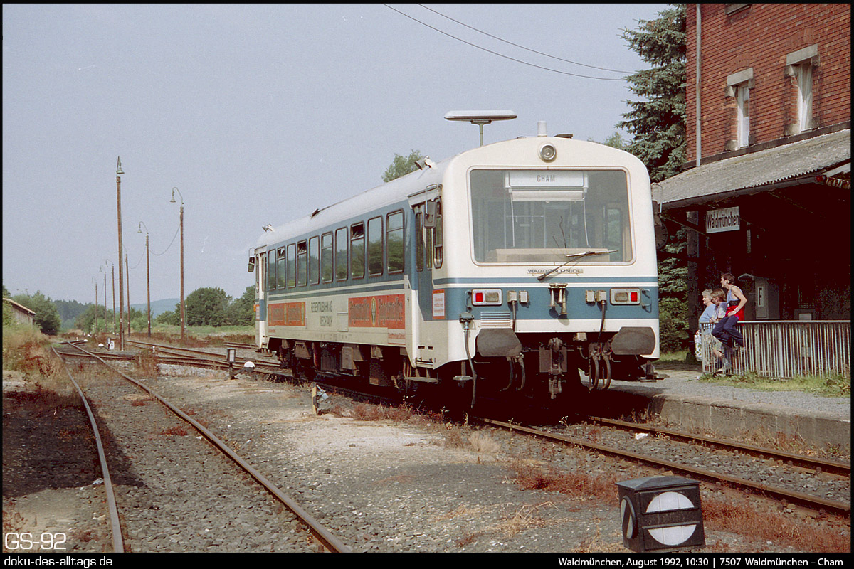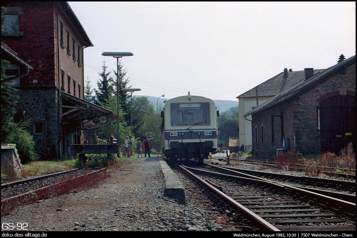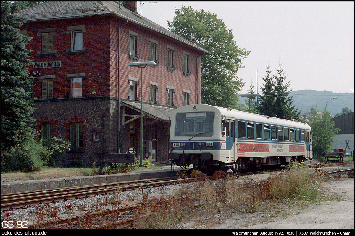 5. + 6.) VT02 der Regentalbahn im Endbahnhof Waldmünchen. Bis zum Sommerfahrplanwechsel am 31. Mai 1992 befuhr die DB mit Schienenbussen die Strecke. Dann übernahm die Regentalbahn den Betrieb.