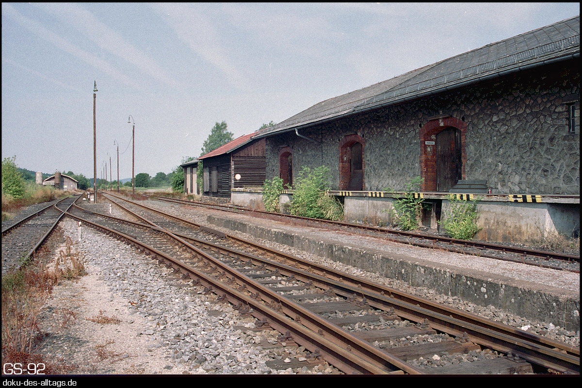 10.) Rechts ist noch der zweiständige Lokschuppen des Endbahnhofs vorhanden, allerdings schon ohne Gleise. Das Bahnhofsgebäude ist heute noch vorhanden, der Lokschuppen nicht mehr. Der Bahnhof Waldmünchen wurde 2002 zum Endhaltepunkt ohne Umfahrmöglichkeiten und wurde weiter Richtung Westen in den damaligen Ausfahrtsbereich versetzt.
