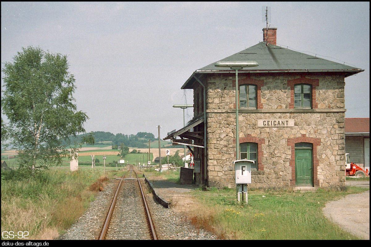 1.) Die Fahrt über die 22 km langen Nebenstrecke nach Waldmünchen dauert etwa 35 Minuten. Nach Cham folgen zunächst die Haltepunkte Willmering (km 4,6), Waffenbrunn (km 6,5), Balbersdorf (km 10,0) und schließlich Geigant (km 13,9), wo noch ein schönes Gebäude aus Bruchsteinen steht.