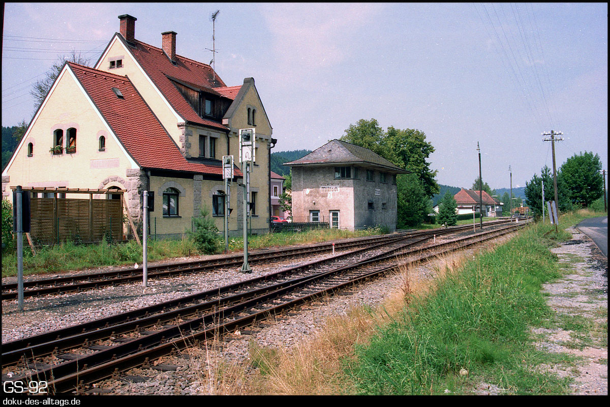 Hier ist auch das große Stellwerk 2 zu sehen, das bis 1994 in Betrieb war. Wenige Jahre zuvor hatte der Bahnhof Miltach noch Formsignale, die jedoch hier schon abgebaut waren.