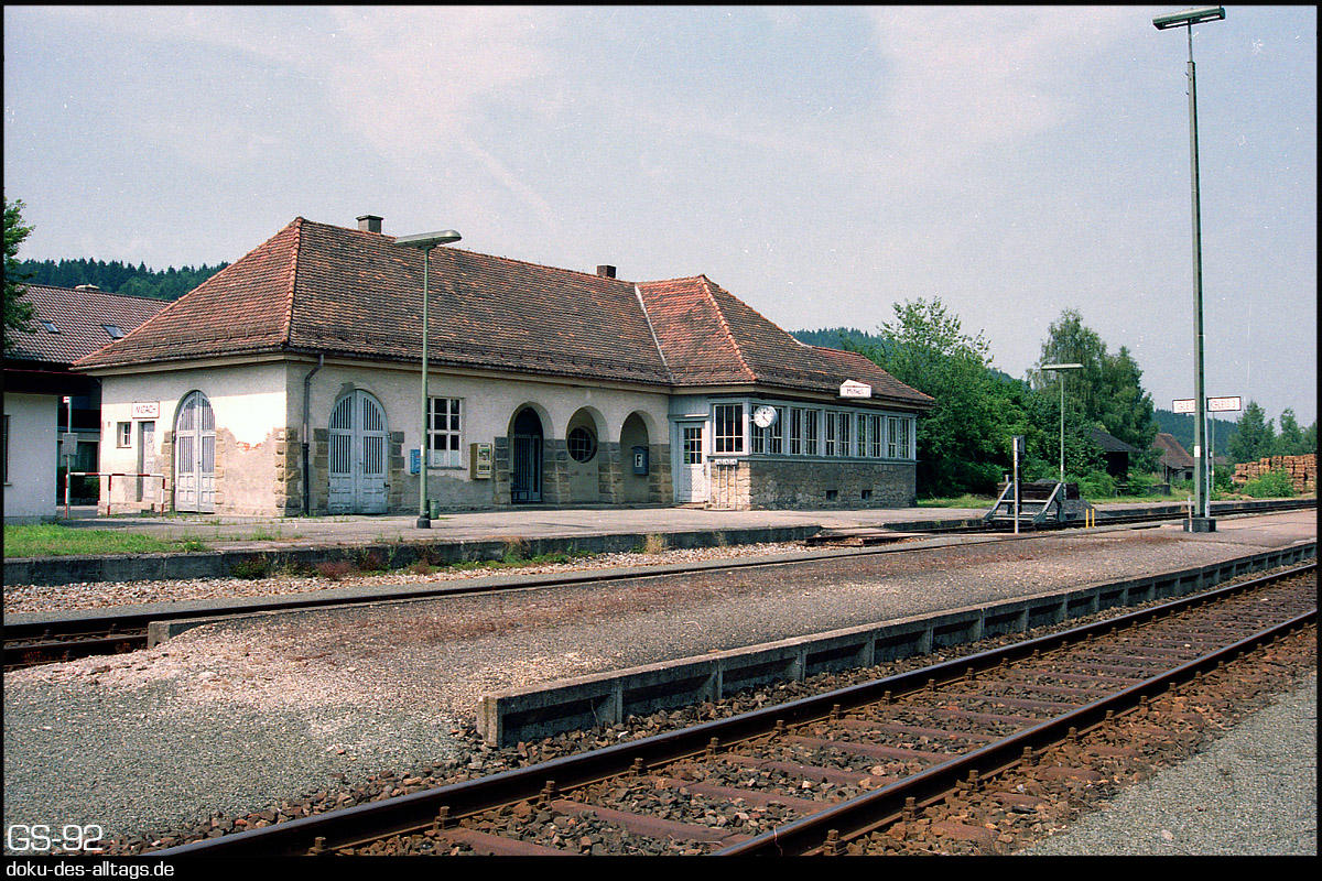 1.) Der Bahnhof Miltach im August 1992. Der Bahnhof verfügte über weitläufige Gleisanlagen für den Personen- und Güterverkehr. Nach Süden zweigte hier die nach Straubing über Konzell und Bogen führende Nebenstrecke ab, die 1984 ihren Personenverkehr verlor. Heute ist der Bahnhof Miltach zum Haltepunkt zurückgebaut.
