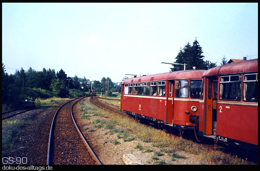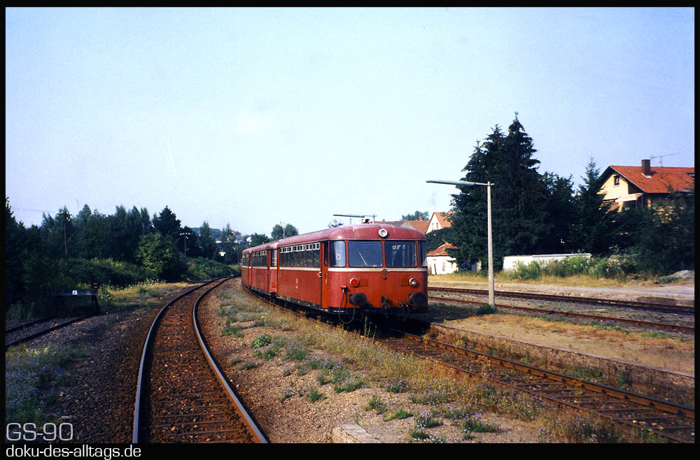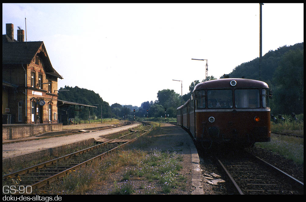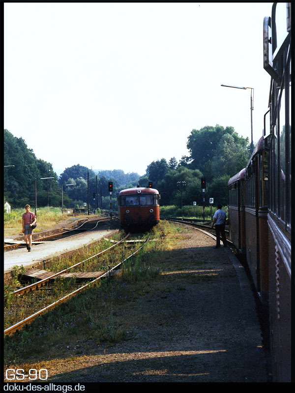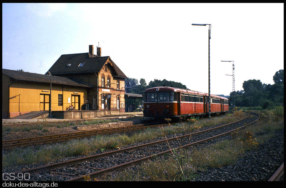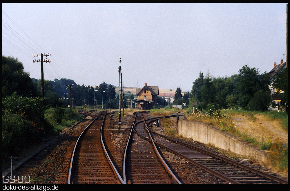 | 1.) Einfahrt in den Keilbahnhof Mörlenbach. 1990 sind die Gleisanlagen noch komplett. | ||||||