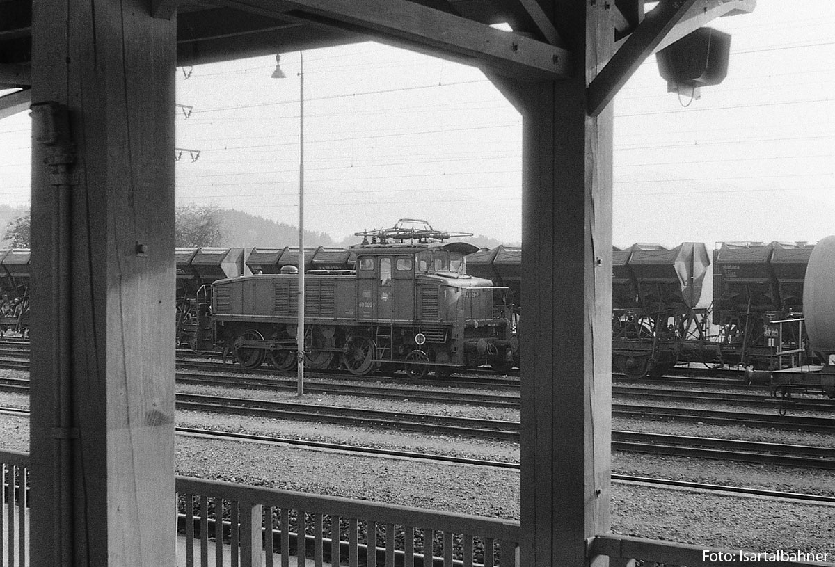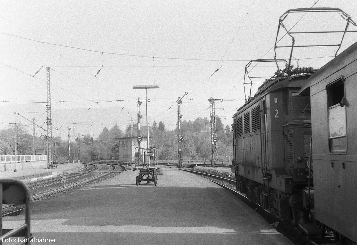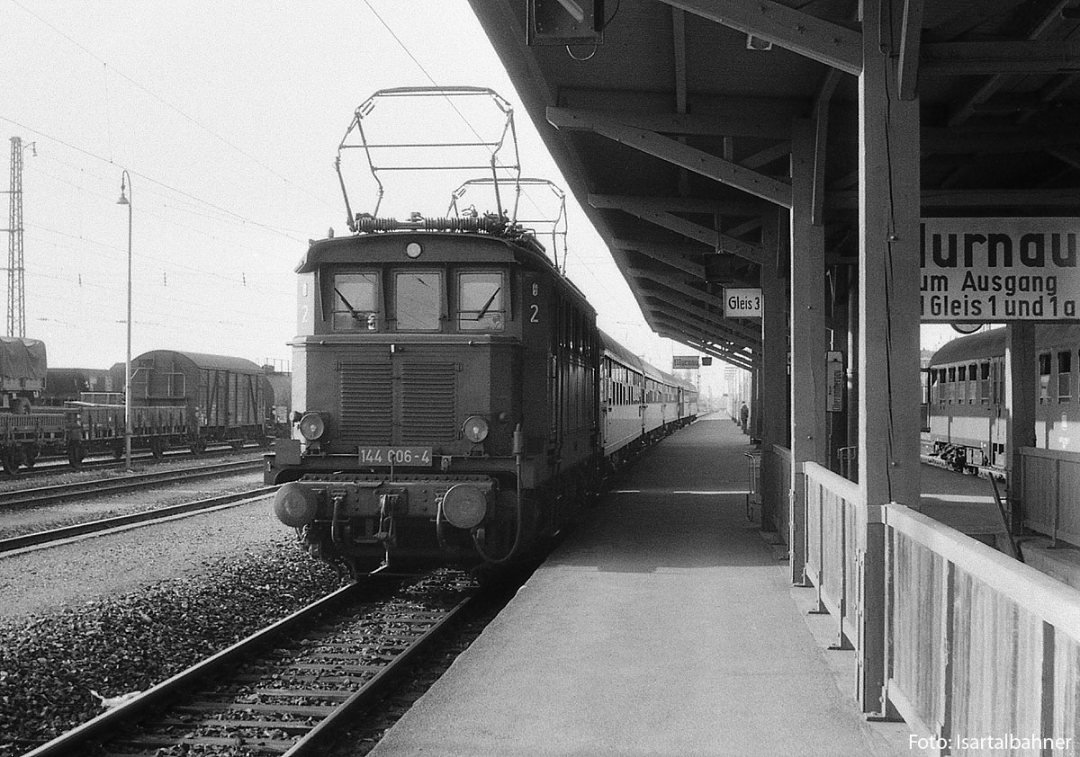 5.) …nämlich der D 1010, den 144 006 am Haken hatte. Dies war die Mittenwalder Kurswagengruppe aus dem Hagener D 510, die in Augsburg vom Stammzug abging. Die Führung Augsburg - Weilheim übernahm ein Diesel, die Bespannung ab Weilheim ins Gamsgebirg nach Mittenwald standesgemäss die E 44. Wie genau damals Fahrpläne eingehalten wurden, zeigt die Übergangszeit in Murnau. Ankunft D 1010 in Murnau um 17:29 Uhr an, der Oberammergauer P 3776 hatte 17:32 Uhr Abfahrt. |