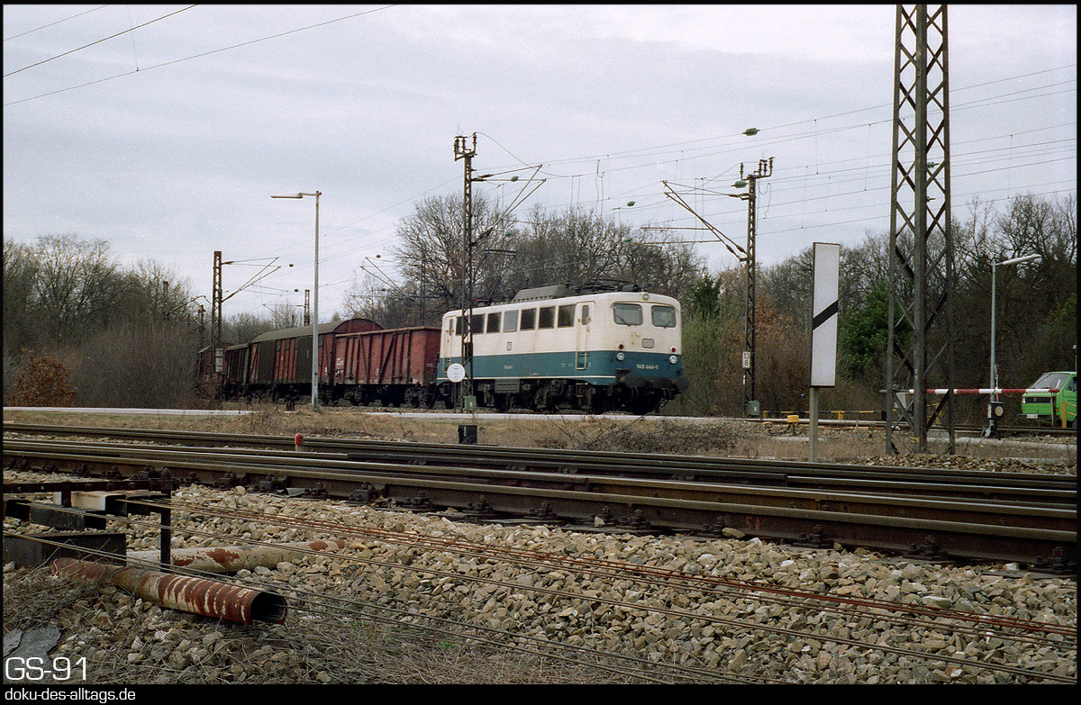 | 1.) 140 444 (Bw Seelze) bei der Einfahrt in München-Ludwigsfeld. Im Hintergrund ist das Einfahrtsignal zu sehen. Der Zug kommt aus Augsburg und bog in Olching auf den Nordring ab. Das Gleis ganz im Vordergrund führt nach Allach, das daneben nach Karlsfeld. | |||||