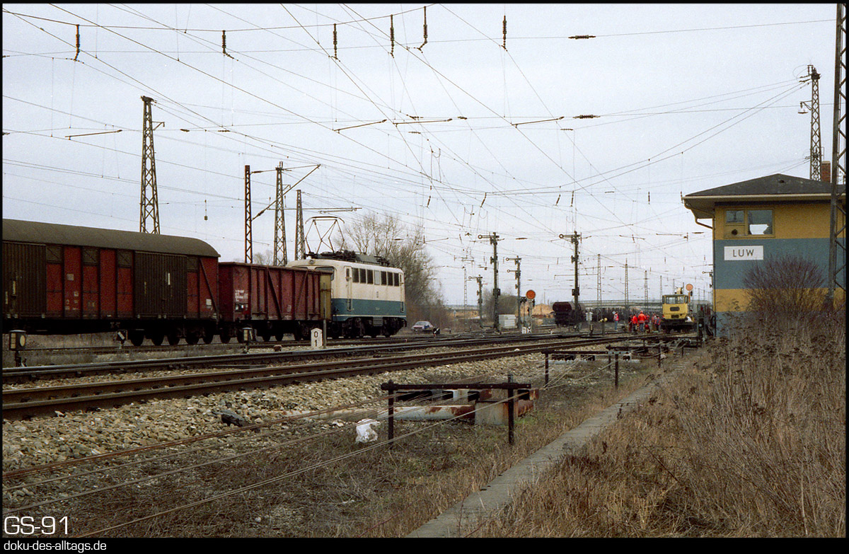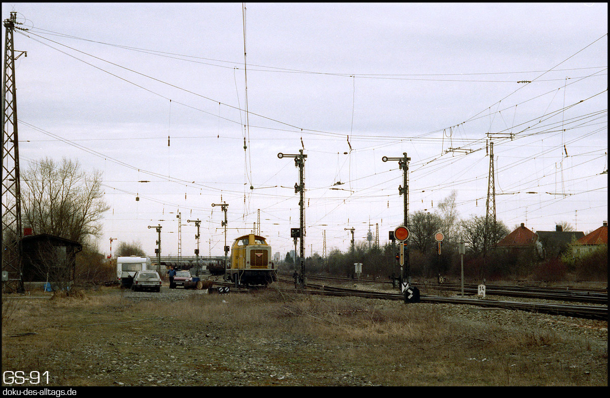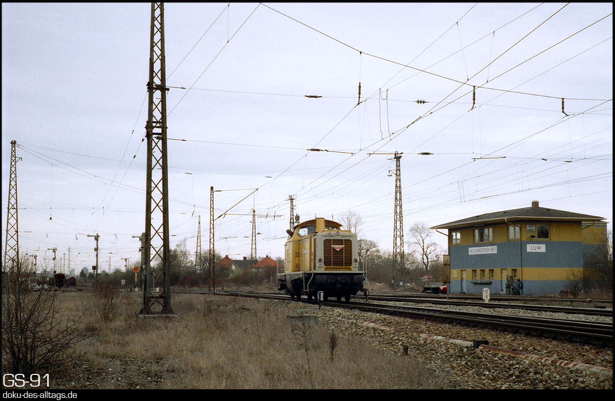 | 6.) Neben dem Wärterstellwerk Lun kommt sie zum stehen. Die verbliebenen Gleise dahinter wurden zum Abstellen von Bau- und Schotterzügen für den Bau des Rbf Nord verwendet. Das Signal ganz links steht am Verbindungsgleis zum neuen Bahnhof. | |||||