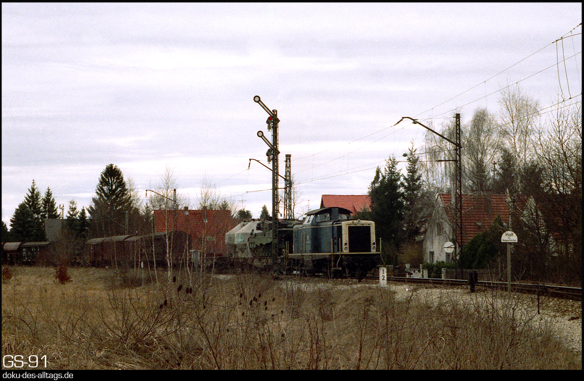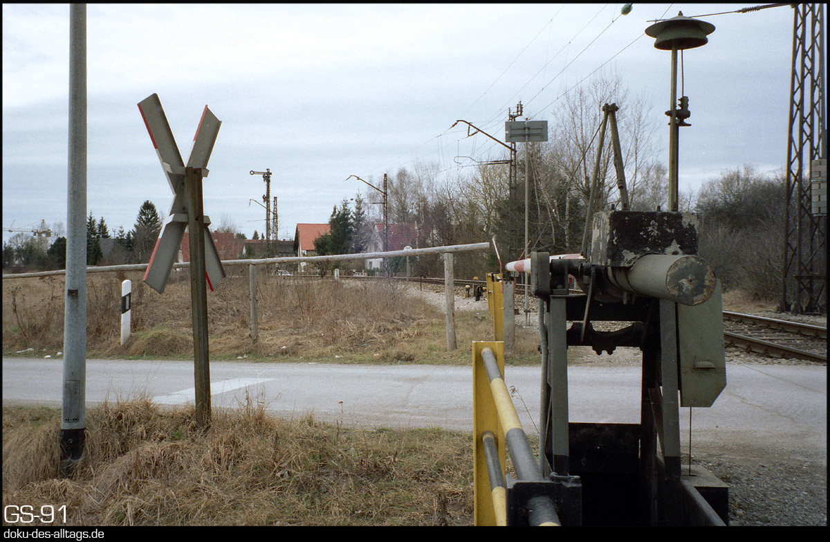 | 9.) Zurück auf die andere Seite des Bahnübergangs der Schrederbächlstrasse, dahinter das Einfahrtsignal von Ludwigsfeld an der Verbindungskurve nach Allach. | |||||