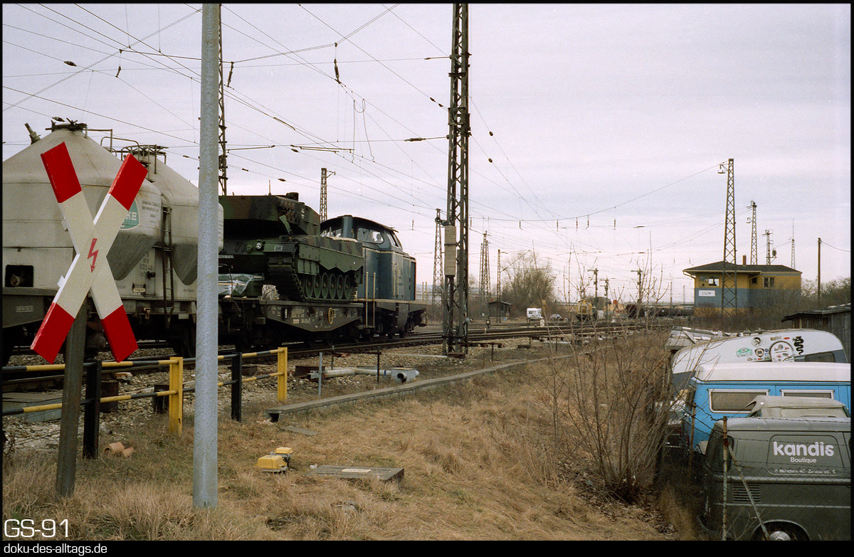 | 2.) Nach der Überquerung des Bahnübergangs geht es am Stellwerk LUW vorbei in den Bahnhof hinein. Hier ist gerade ein Bautrupp zugange. Im Hintergrund sind die bereits fertiggestellten Brücken zu sehen, die heute die Gleisanlagen des Rangierbahnhofs München Nord überspannen. | |||||
