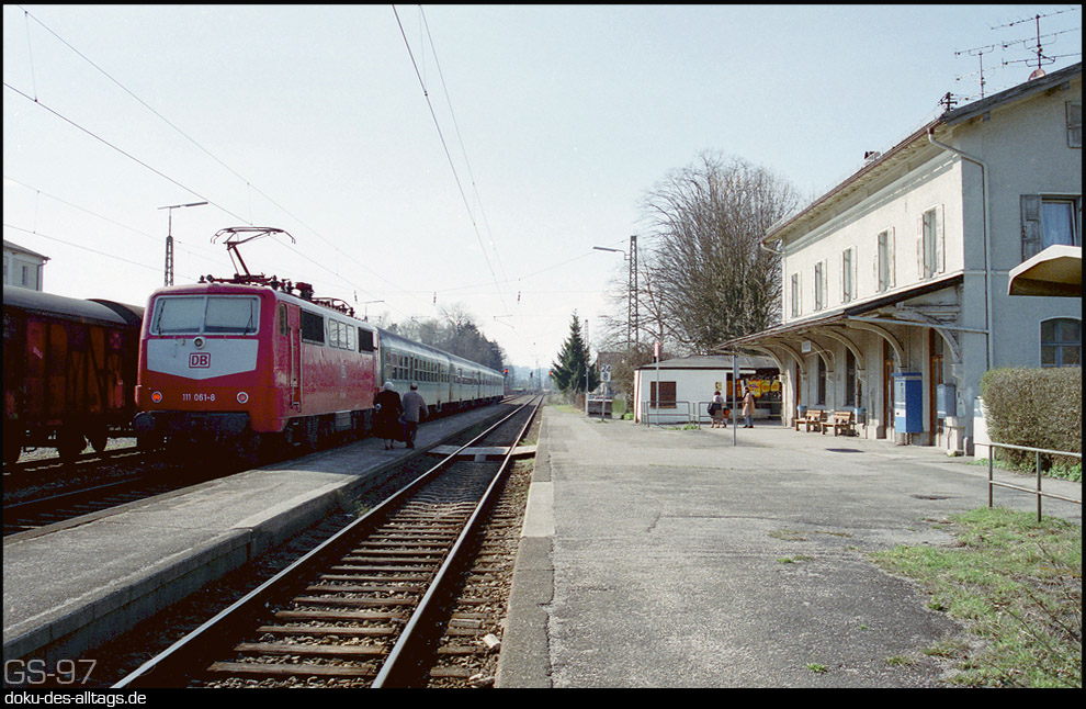 3.) Mein erster Zwischenhalt 1997 in Bruckmühl. Hier gabs eine Kreuzung mit einem Klv + Schüttgutwagen, der leider schneller den Bahnhof verließ als ich knipsen konnte. | ||||||||
