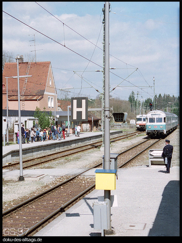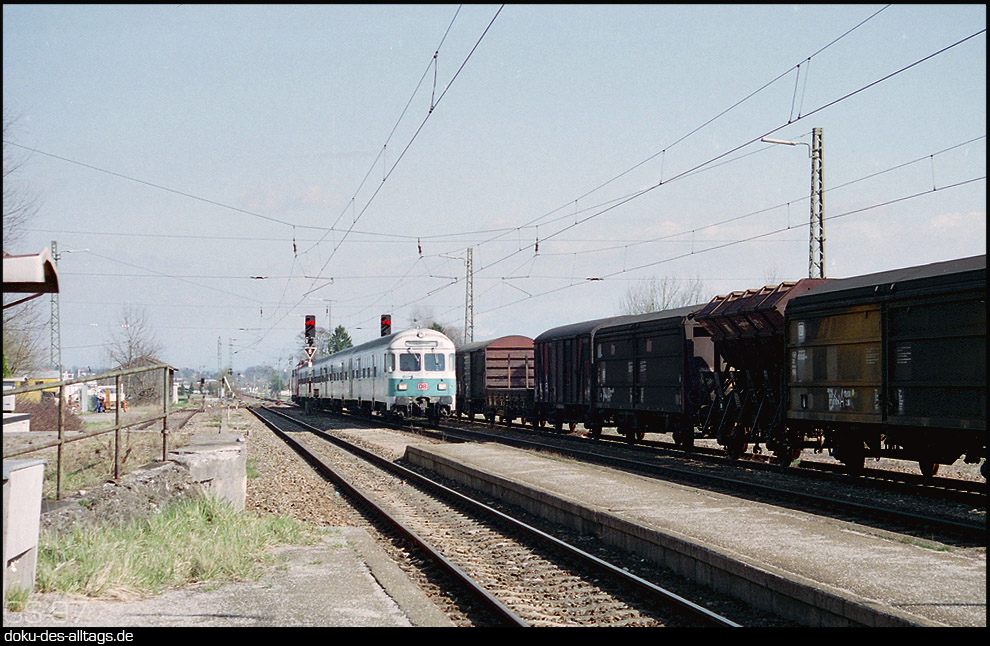 2.) Bahnhof Kreuzstraße 25 Jahre später. Wieder kreuzen 3 Züge. Auf den Gleisen 1 und 2 Paralleleinfahrt von S-Bahn aus Freising und RB 15220. | ||||||||