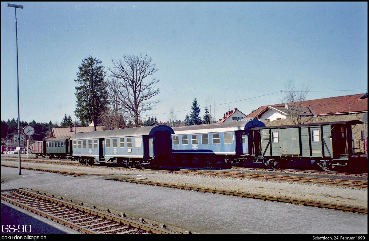 2.) Zurück zum Vormittag des selben Tages. Einfahrt des E 3585 aus München um 11:32 in Schaftlach. Lok 14 wartet schon auf Gleis 3, um den hinteren Zugteil für die Fahrt nach Tegernsee zu übernehmen (24. Februar 1990). | |||