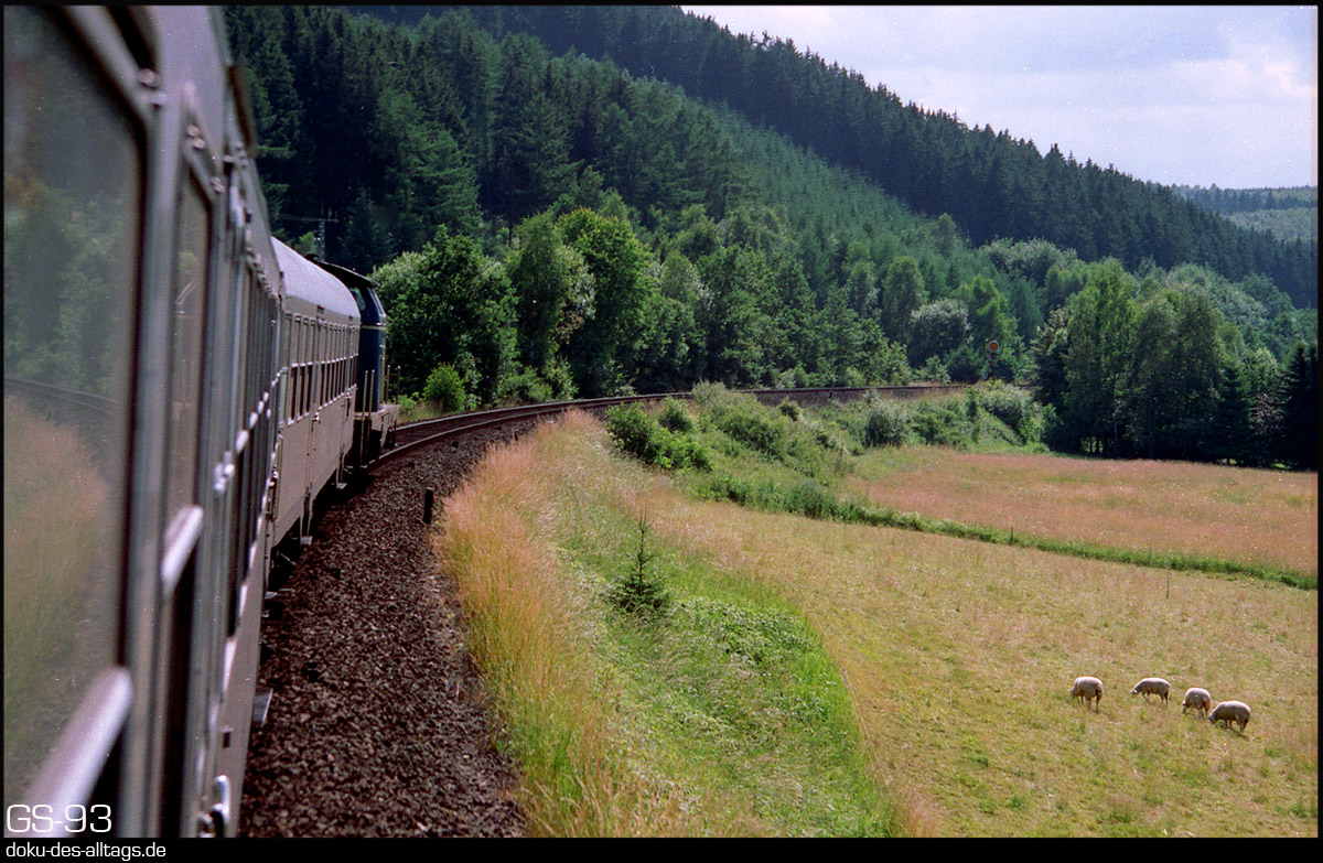 | 4.) Idyllische Sommerlandschaft mit Schafen beim Einfahrvorsignal vom Bahnhof Ferndorf. Das Signal zeigt Vr 2. | |||||||