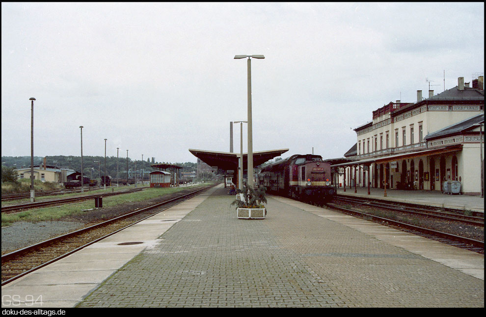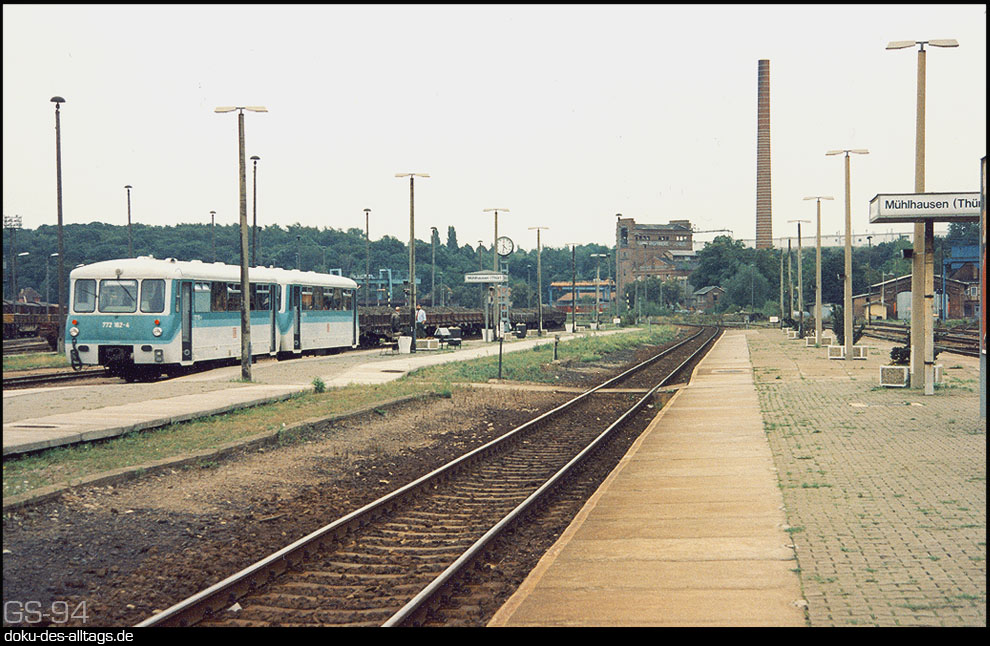 79. + 80.) 772 164 verlässt als 14236 Mühlhausen auf dem Weg nach Schlotheim. Dieser 17 km lange Rest der Ebelebener Bahn wurde im Personenverkehr noch bis 1998 betrieben. 1994 pendelten 11 Zugpaare über die Strecke. Im Hintergrund thront die Kammgarnspinnerei Mühlhausen. Hier machen die Gleisanlagen einen scharfen Bogen nach Osten, dort sind auch die Ausfahrtsignale zu erkennen. Der 772 hat Hp1 auf die Schlotheimer Strecke. Ganz am linken Bildrand ist das Walmdach des Stellwerks Ms zu sehen. Vor der Kammspinnerei steht eine Ludmilla, etwa auf dieser Höhe zweigte früher die Strecke nach Treffurt in südlicher Richtung ab. Rechts der Lokbahnhof Mühlhausen, der noch bis 1997 in Betrieb war. In den 80er Jahren wurden drei V60 von hier aus eingesetzt, in den 90ern war es noch eine. |
