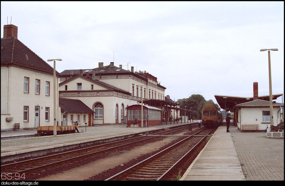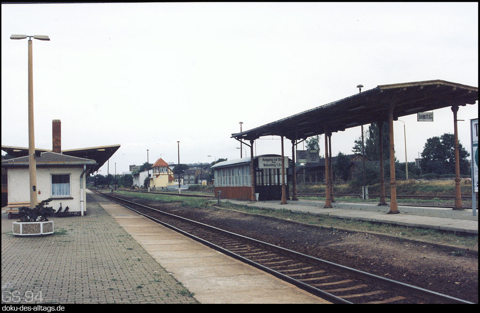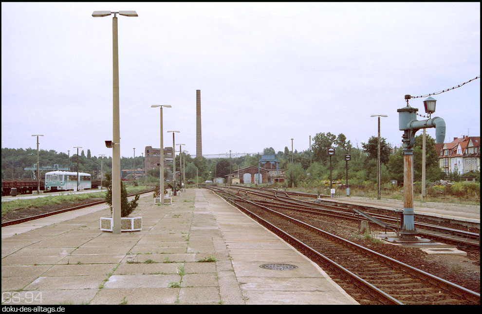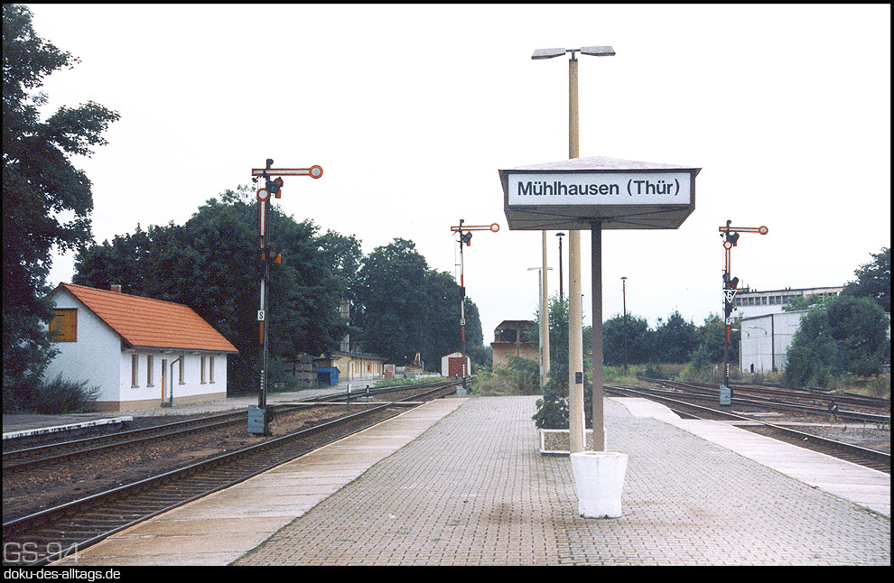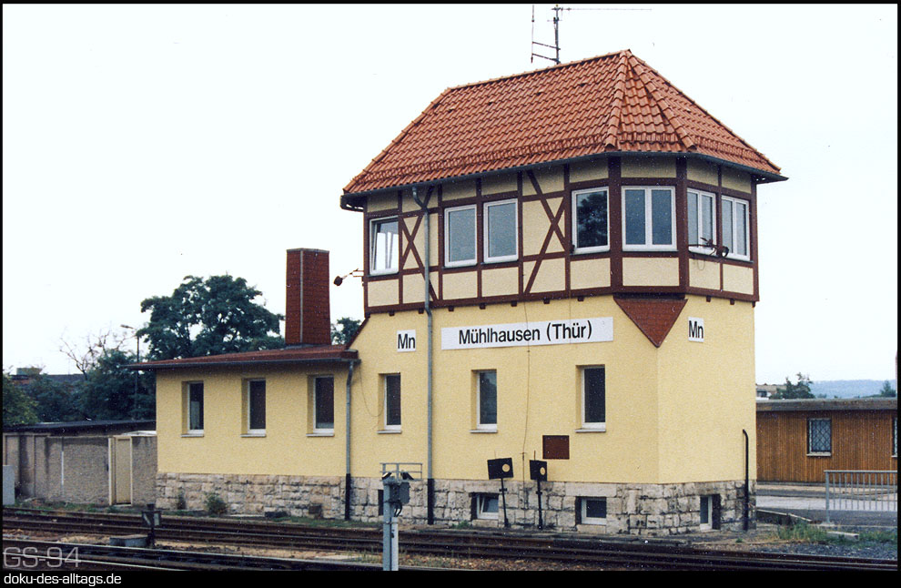 78.) Das Stellwerk Mn macht 1994 einen frischen Eindruck. Es wurde 1911 in Betrieb genommen, im Zuge eines groß angelegten Bahnhofsumbaus. Während die Strecke Gotha Leinefelde bereits seit 1870 besteht, wurde 1897 die private Mühlhausen-Ebelebener Eisenbahn eröffnet. Diese hatte ihren eingenen Bahnhof abseits des Staatsbahnhofs. Mit dem Bau der Bahnlinie nach Treffurt wurde beschlossen, die beiden Bahnhöfe zu einem einzigen Bahnhof zusammenzufassen. Die 31 km lange Bahn nach Treffurt verband Mühlhausen mit der schon seit 1902/1907 bestehenden Strecke Schwebda Wartha. Von Mühlhausen nach Treffurt fuhr 1953 der letzte Zug, dann endete die Strecke in Wendehausen. Dieser Rest wurde 1968 komplett eingestellt. Die beiden elektromechanischen Siemens & Halske Stellwerke Mn und Ms waren bis zum Jahr 2000 in Betrieb, dann wurde Mühlhausen mit dem ESTW Leinefelde verknüpft. |